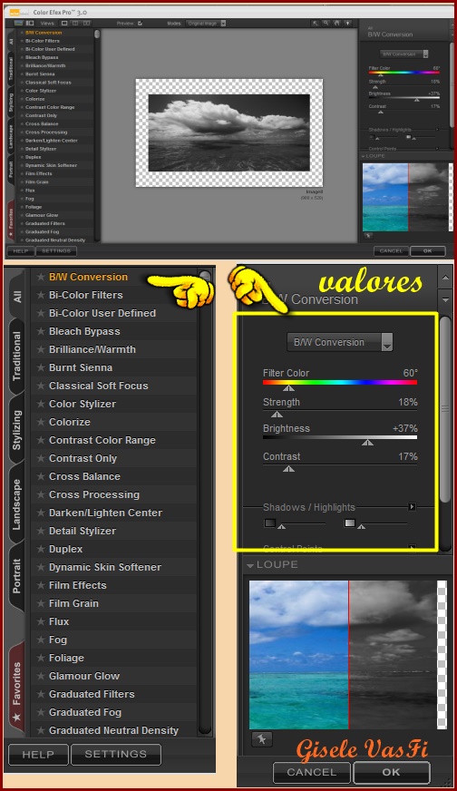 09- Ative a paisagem 2 e aplique o filtro Nick Color Efex 3.0 > B/W Conversion, mude os valores na coluna da direita conforme o print.